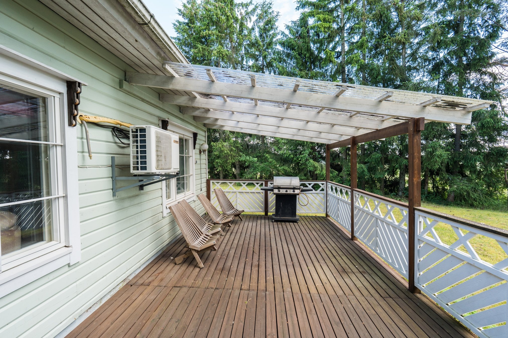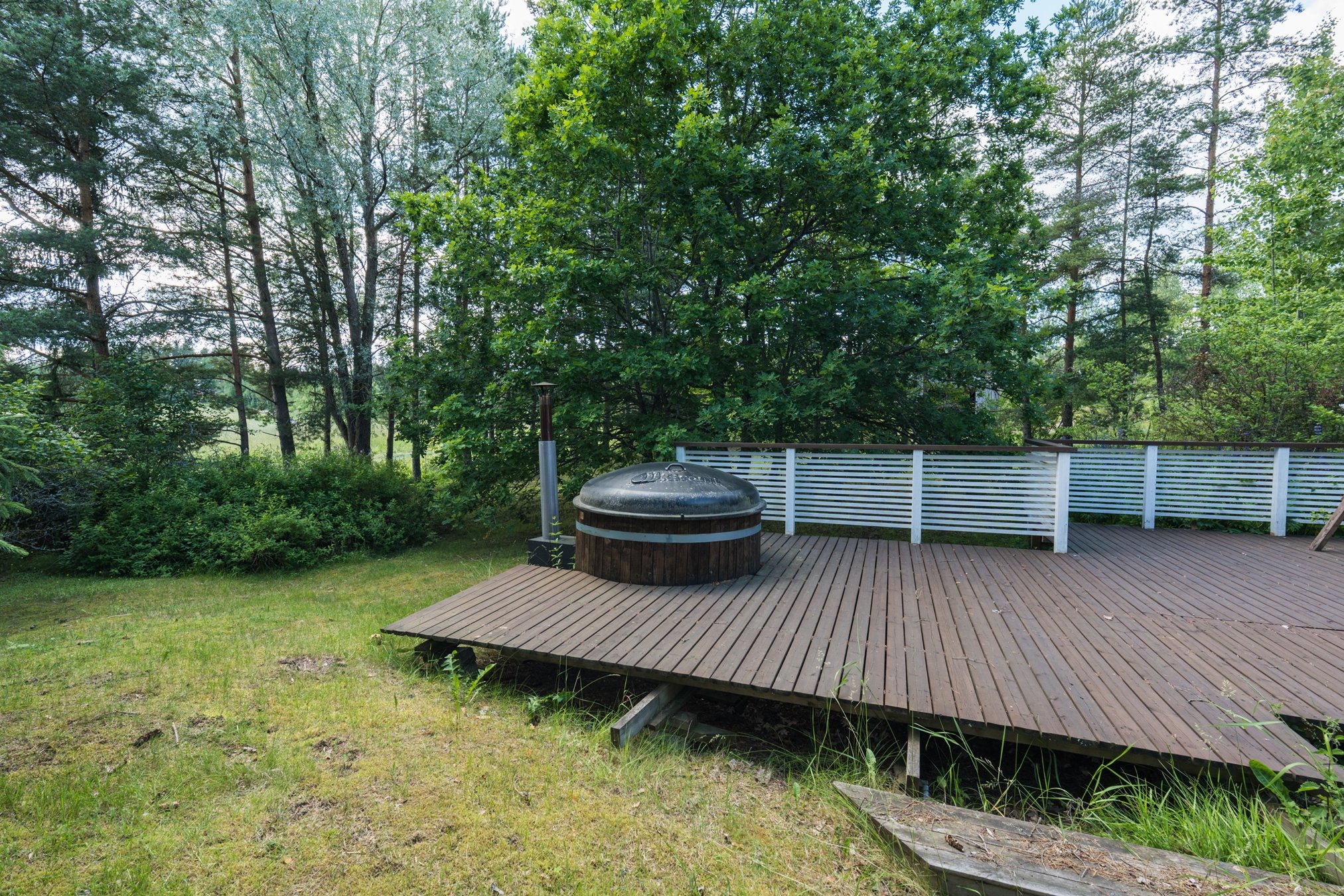 Rakennuksen etuoven edessä on pieni lasitettu terassi. Tämän lisäksi on tilava, osittain katettu terassi, joka avautuu länteen. Terassin päähän on asennettu kylpytynnyri. Piha-alueella on puustoa ja nurmialuetta.