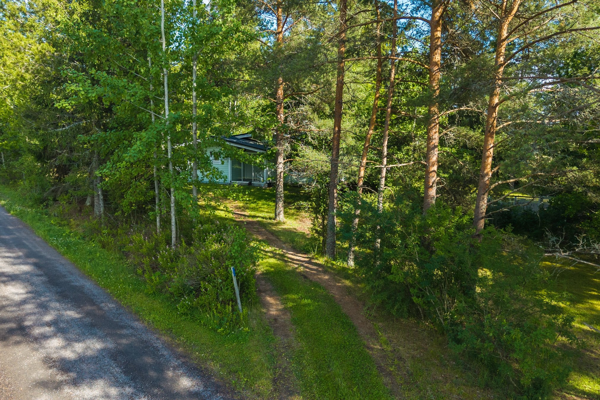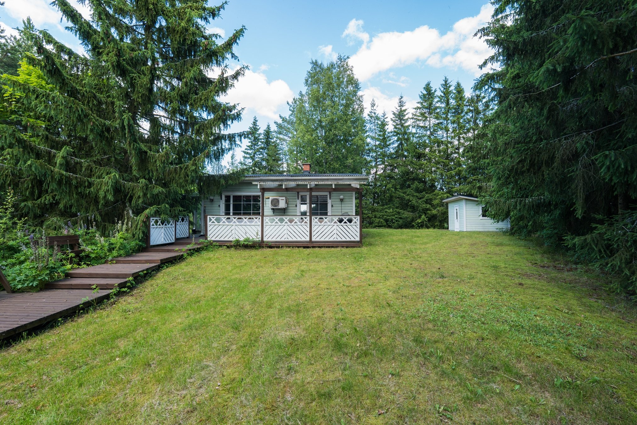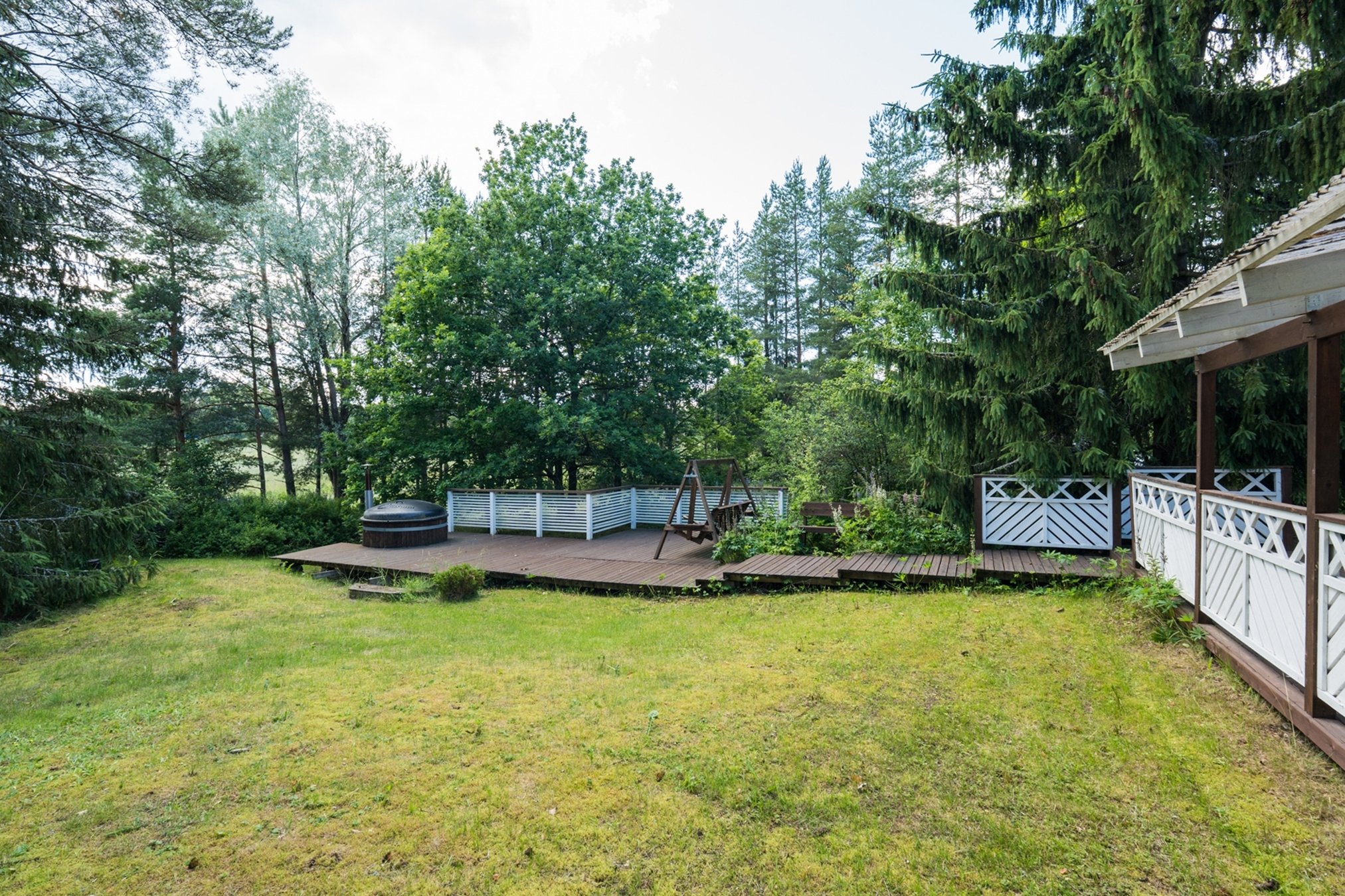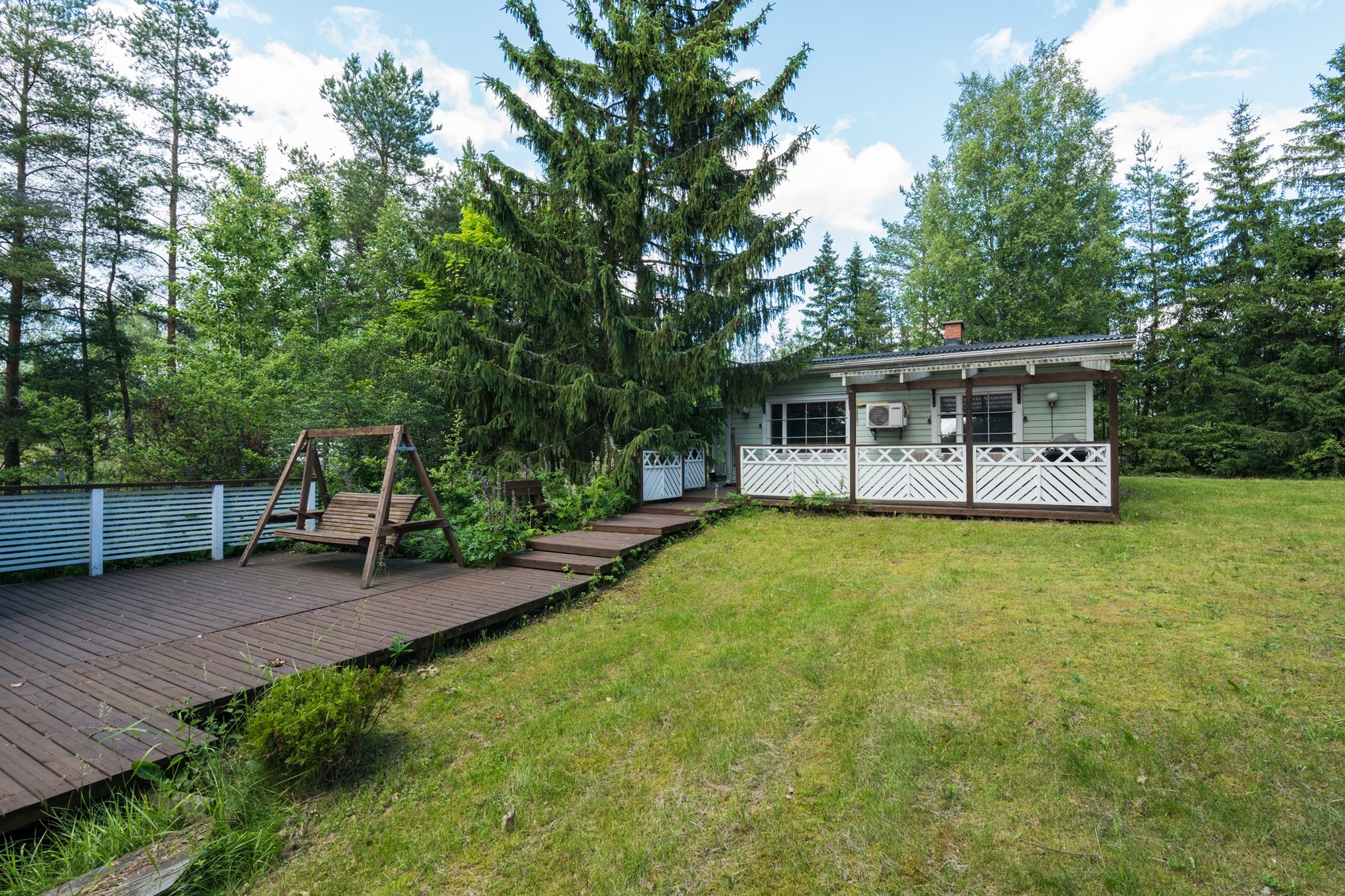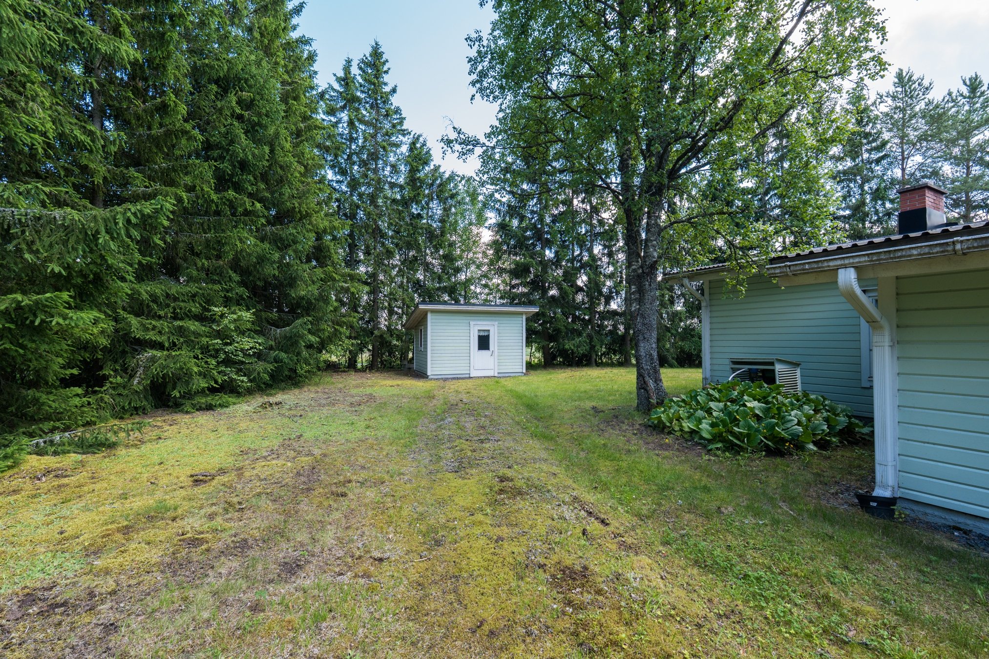 Tasainen tontti, jossa on nurmialuetta ja puustoa.