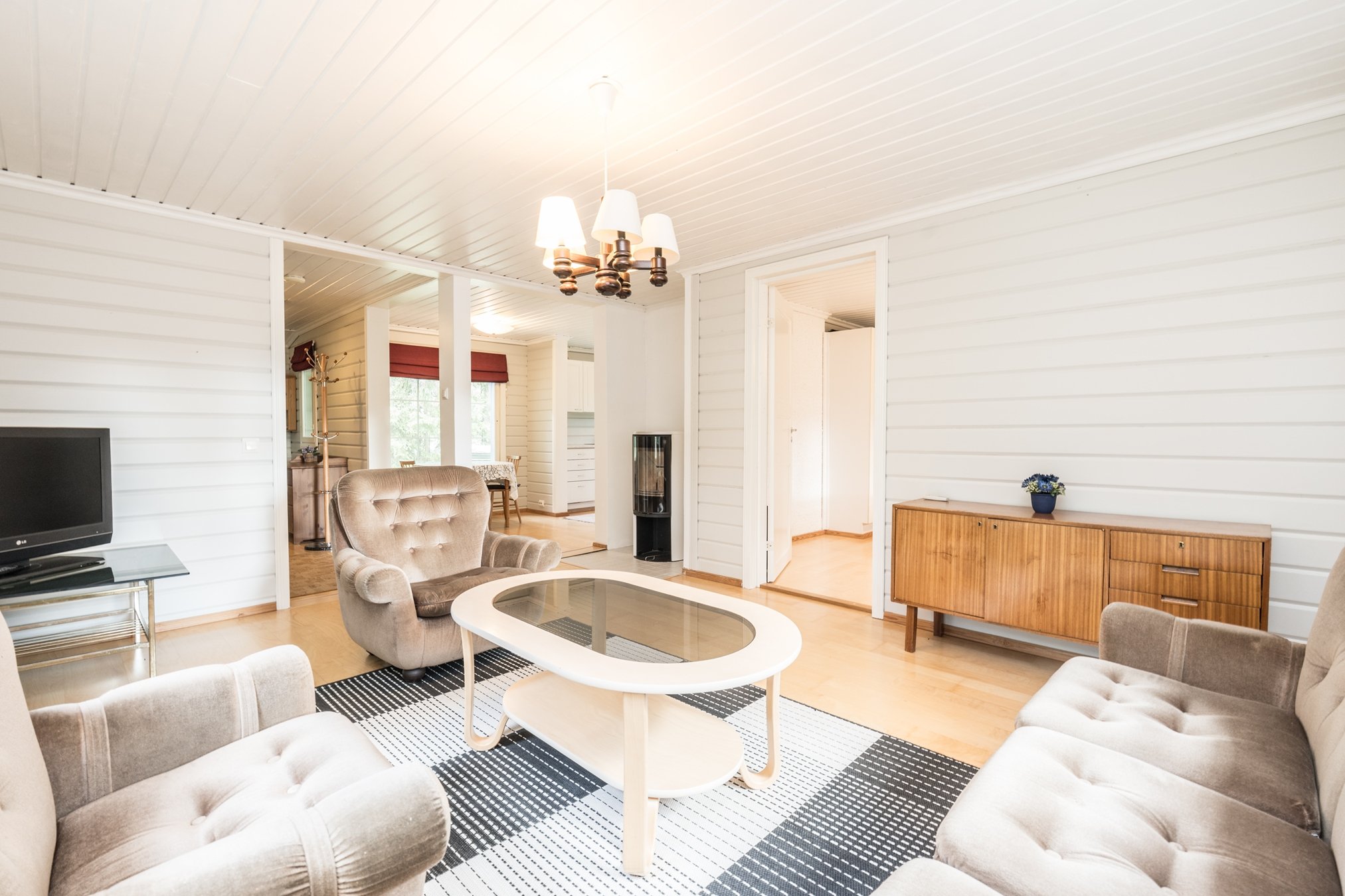 Avarassa olohuoneessa on ilmalämpöpumppu sekä Conturan takka. Keittiö on hyväkuntoinen ja sen yhteydessä on ruokailutila.