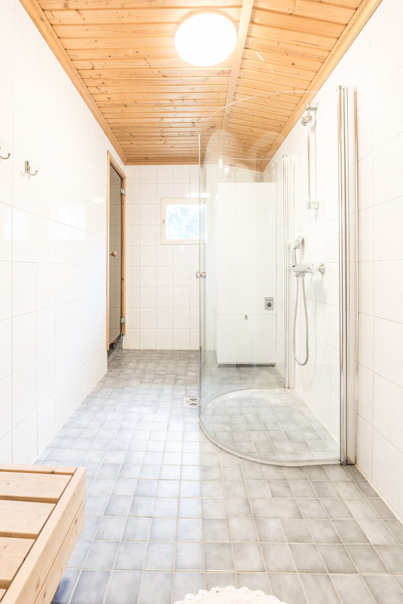 Suihku, suihkukaappi, pesukoneliitäntä, lattialämmitys ja lämminvesivaraaja