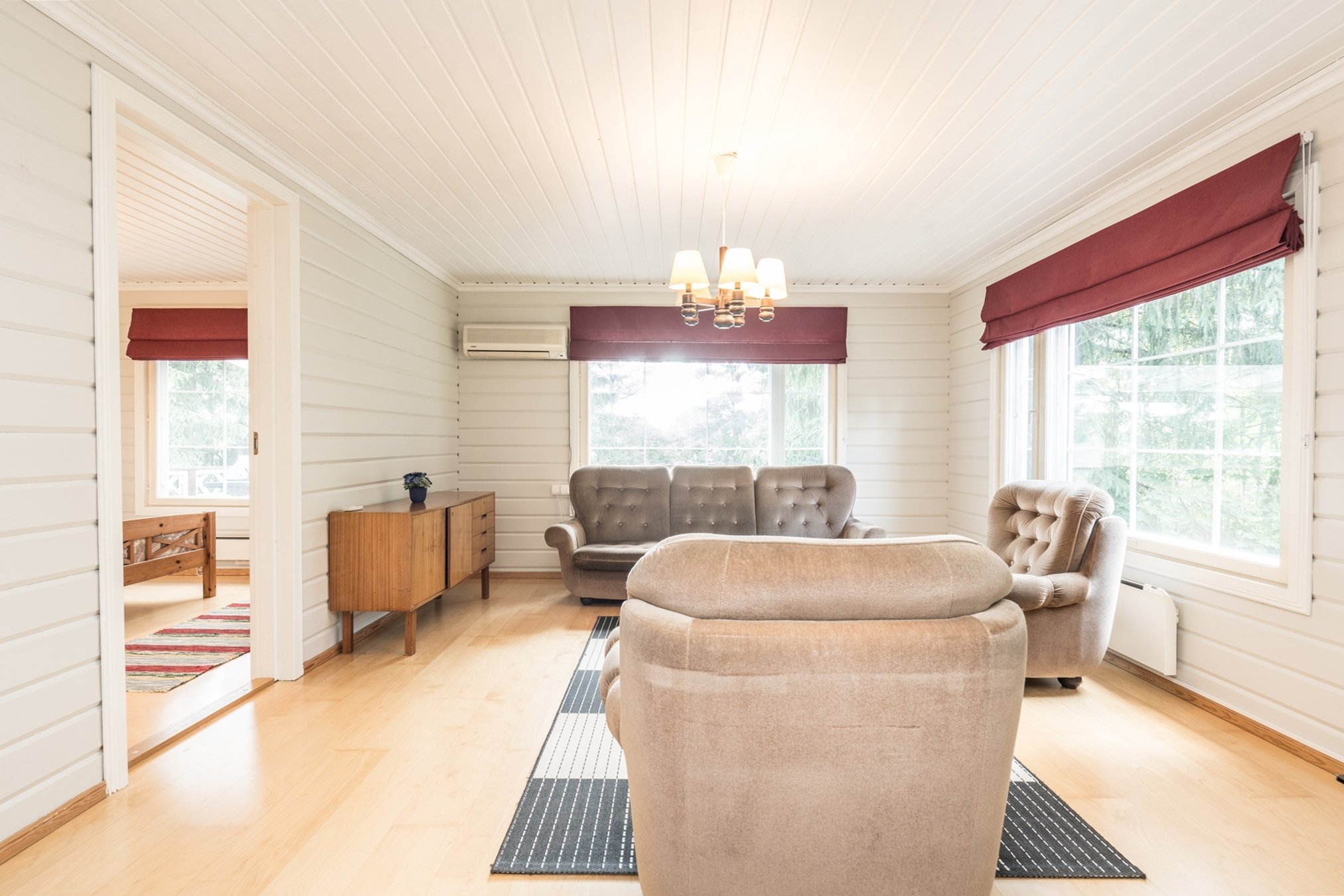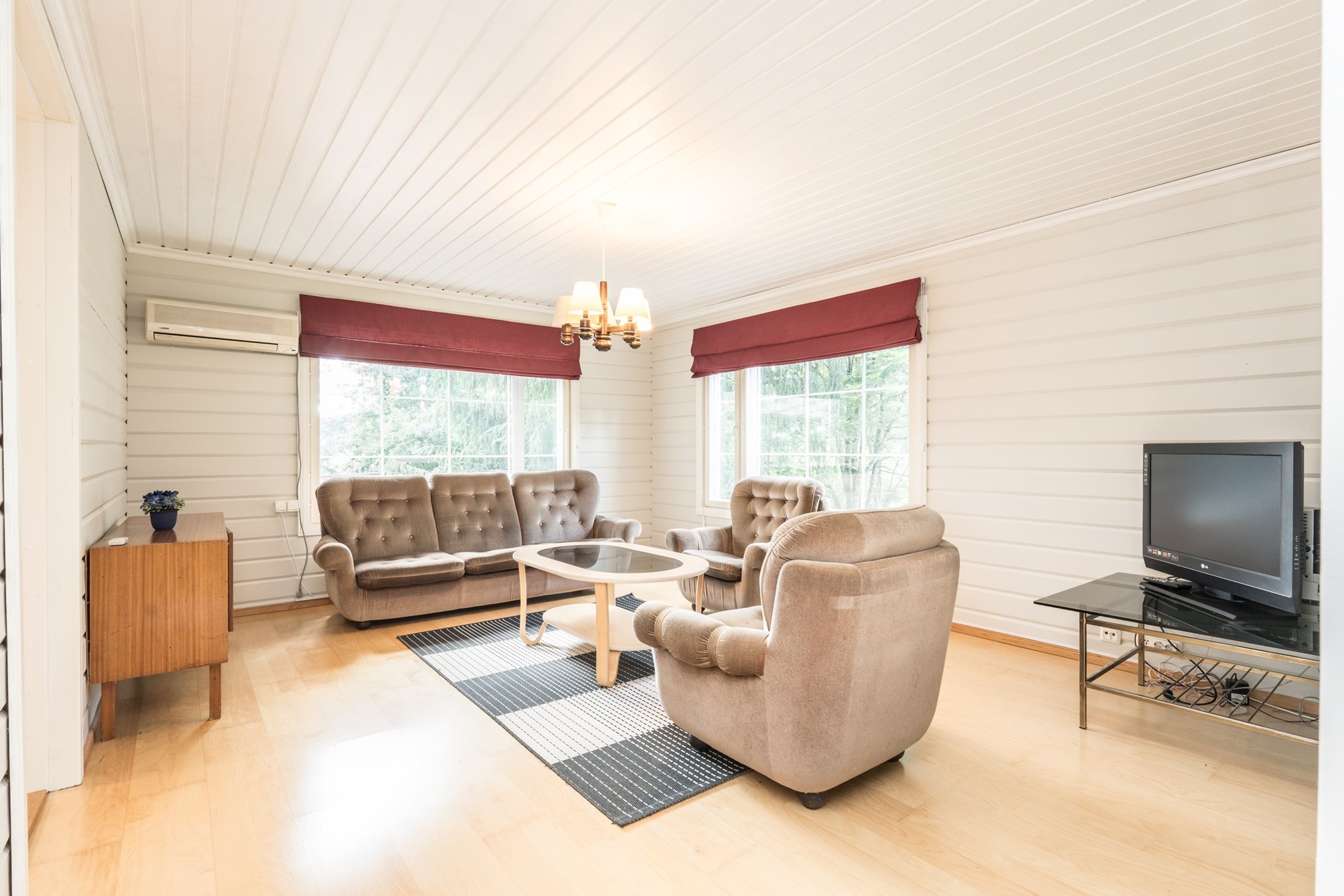 Avara olohuone, jossa on ilmalämpöpumppu. Olohuoneessa on Conturan takka.