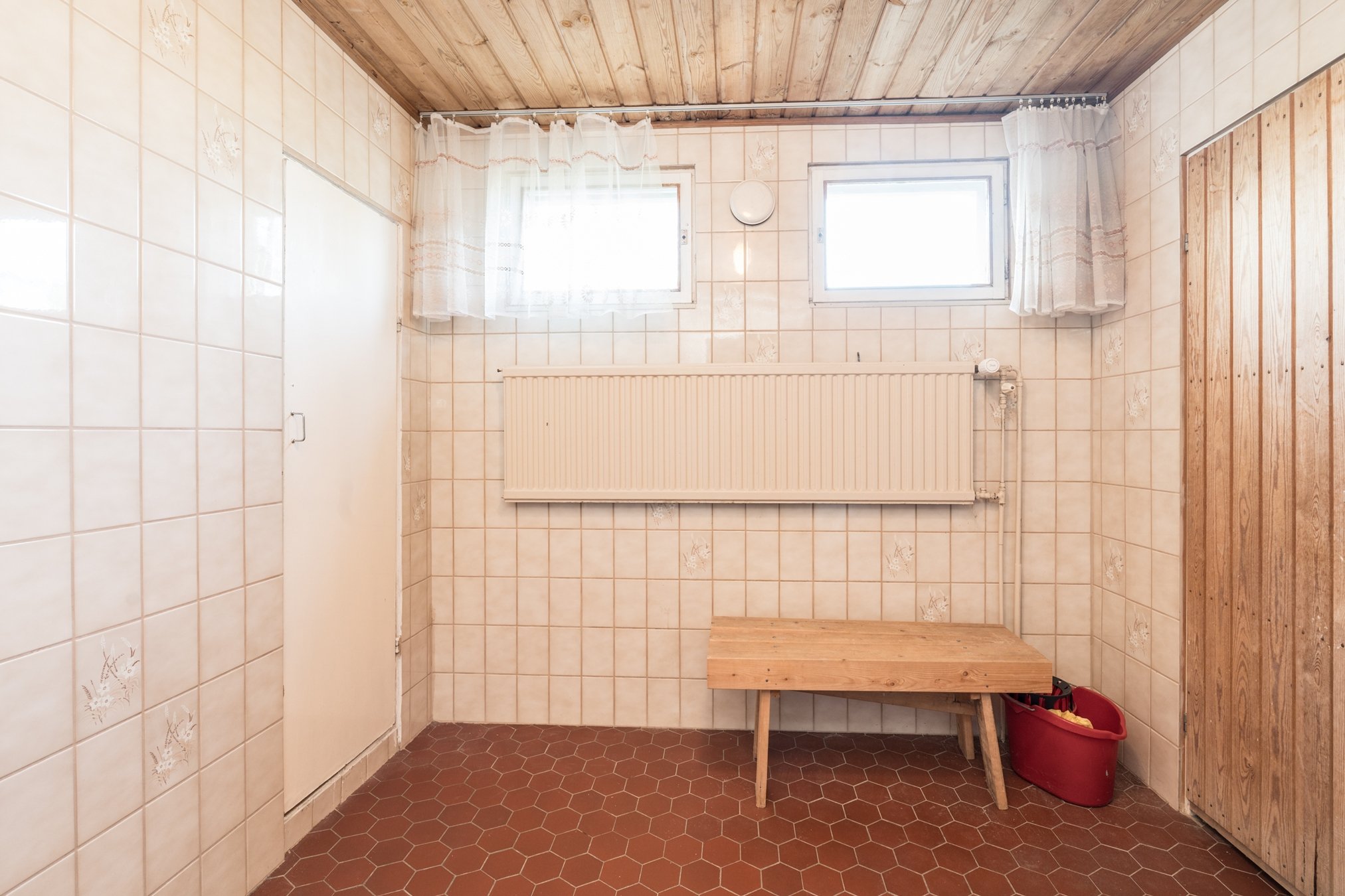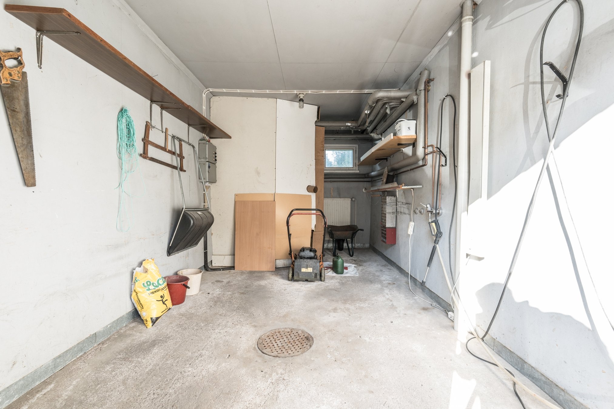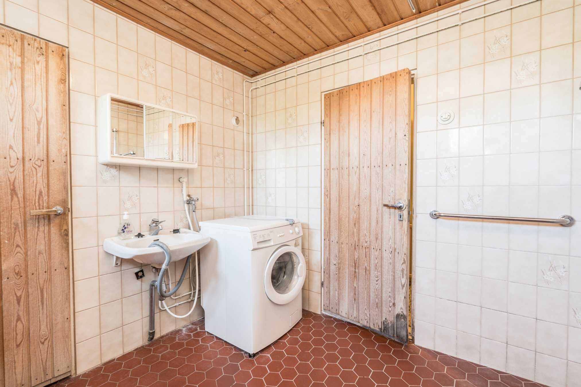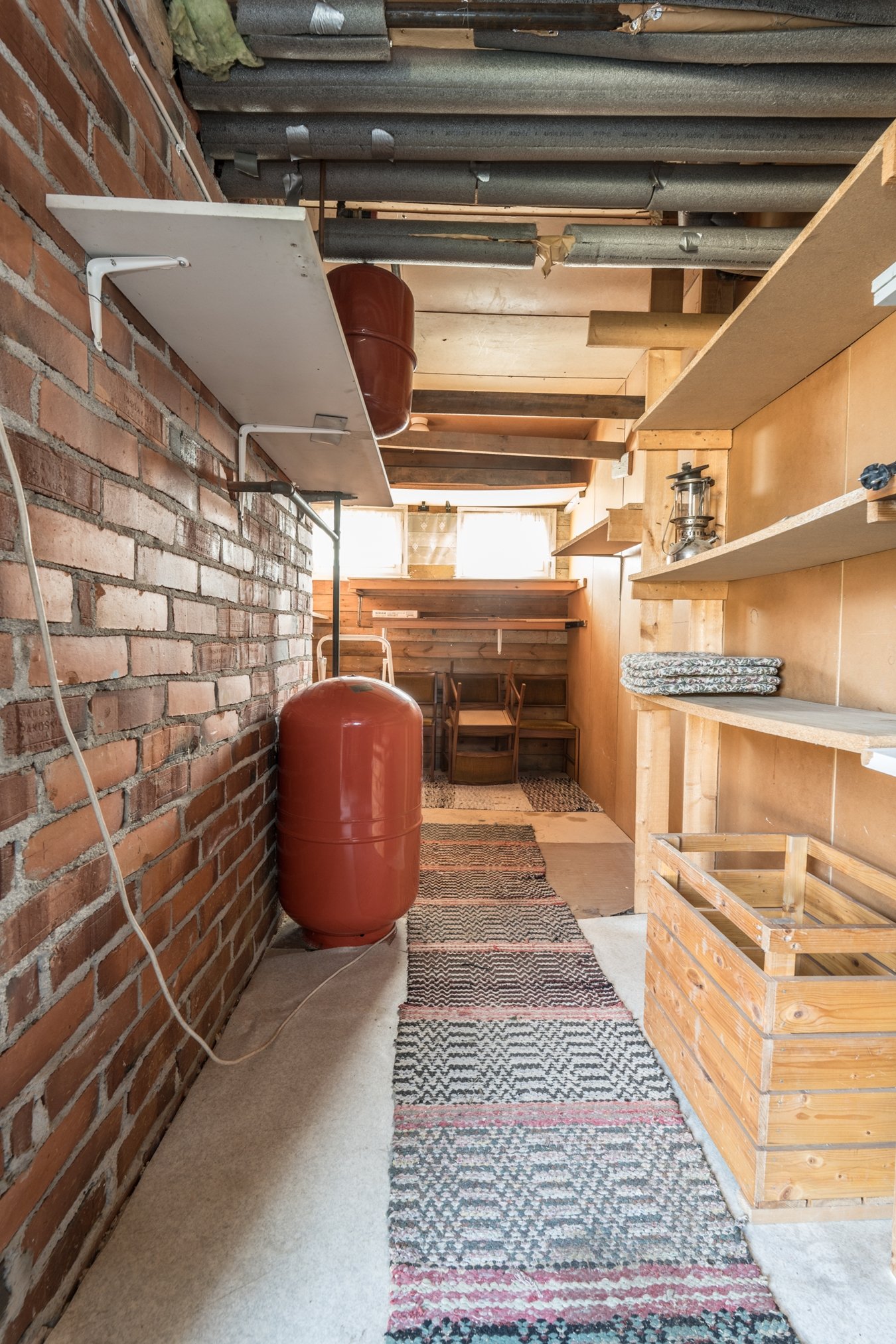 Käytävän varrella on 6 kaappia. Pesuhuoneesta on kulku lämpimään varastotilaan, jota voi käyttää vaikka työtilana. Autotalli sijaitsee talon päädyssä. Autotallissa on tilava lämminvesivaraaja.
