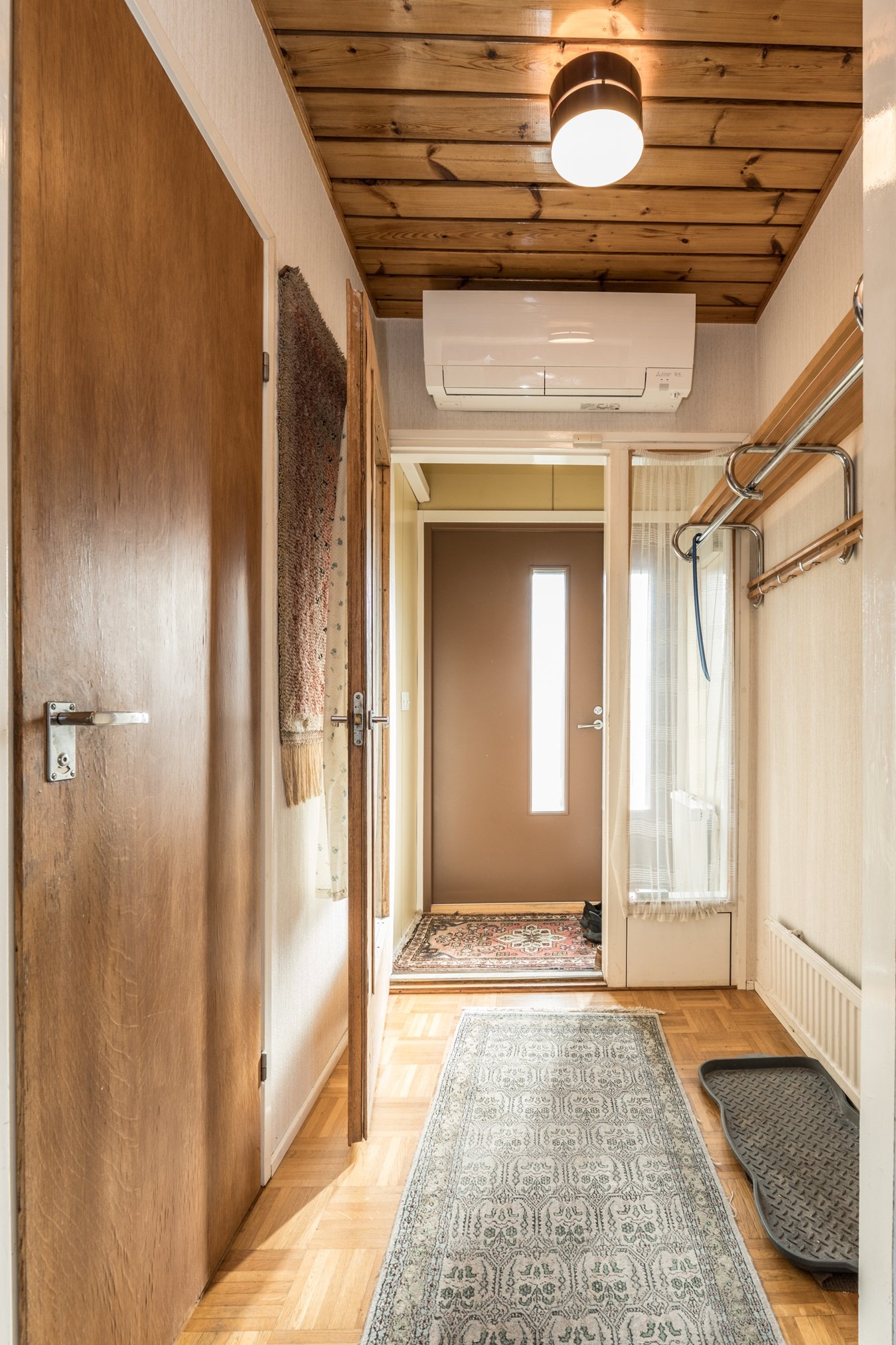 Eteisessä on ilmalämpöpumppu. Eteisestä on kulku takapihalle.